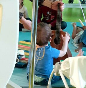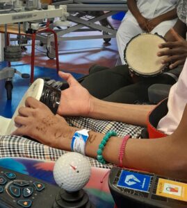 De l’initiation à la batterie aux body-percussions, en passant par la large palette acoustique de cette famille d’instruments (tambour, bâton de pluie, ocean-drum terre thunder…), les patients sont invités à développer différents modes de jeu et de communication, des qualités d’écoute et des clés les menant à l’improvisation.